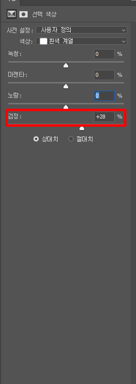선택 색상에서 흰색 계열에서 검정을 올려줍니다
