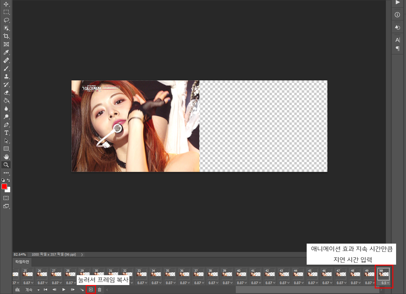 1번 움짤의 끝 프레임을 복사해서 화면을 넘기는 효과가 지속될 시간을 지연 시간에 적어주시고,
